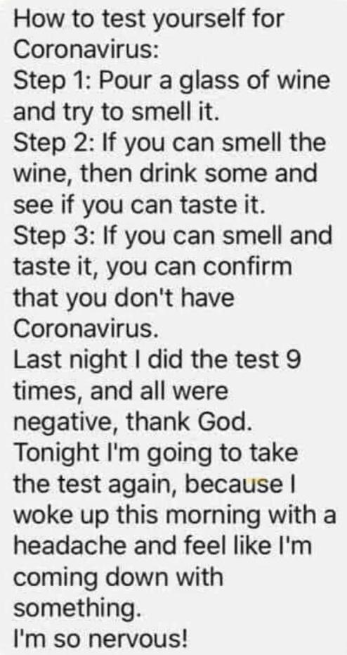 The efficacy of this Covid-19 Self-Test is uncertain, but a number of Choir members have reported that the accuracy of the result is without doubt. Please use it responsibly if you choose to do so. |